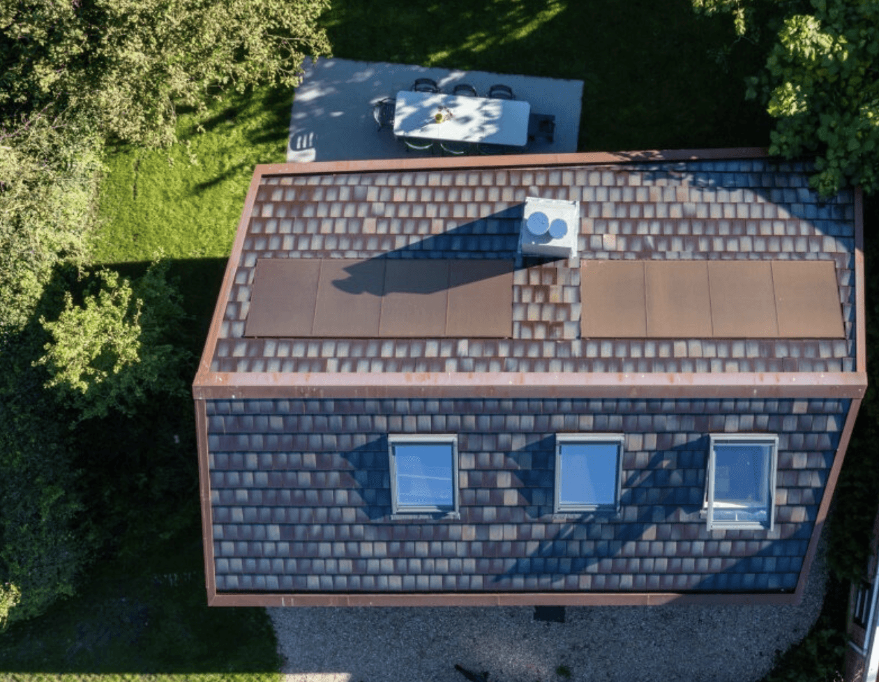 Het dak is gemaakt door Koninklijke Tichelaar in Makkum en bestaat uit grote vlakke dakpannen. Ieder met een unieke bruin groene teint en stuk voor stuk handmatig geglazuurd. De daklijst en goten zijn volledig uitgevoerd in koper en het dak is voorzien van bijpassende zonnepanelen.